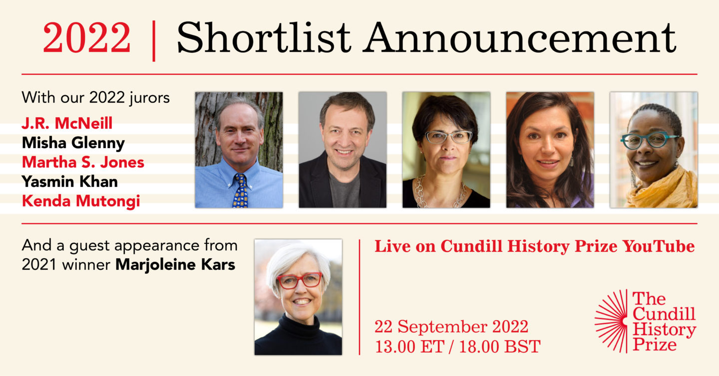 For the first event in our 2022 season, join jury chair J.R. McNeill and jurors Misha Glenny, Martha S. Jones, Yasmin Khan, and Kenda Mutongi as they reveal their eight-book shortlist